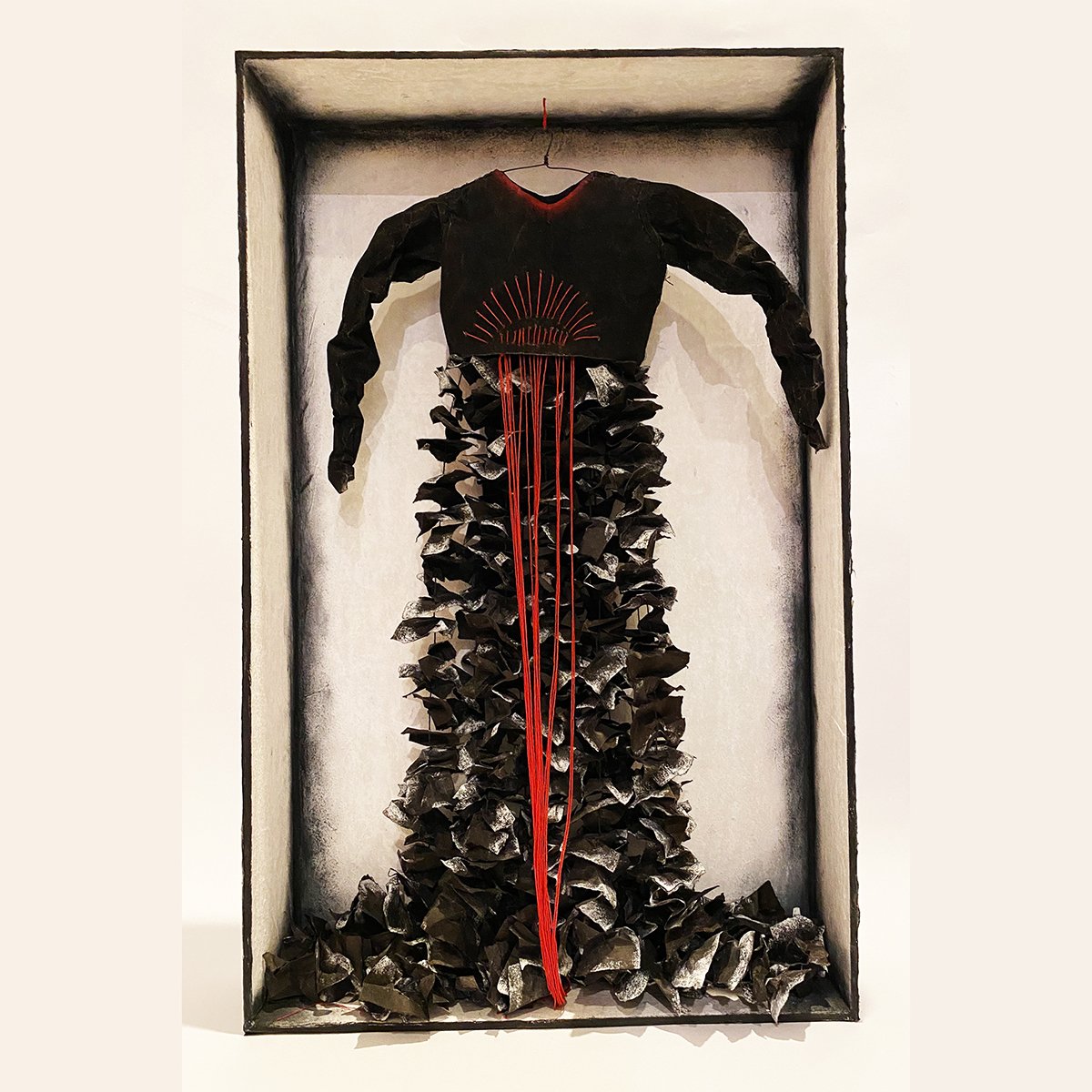 Mixed media - Fabric strands, paper and found objects