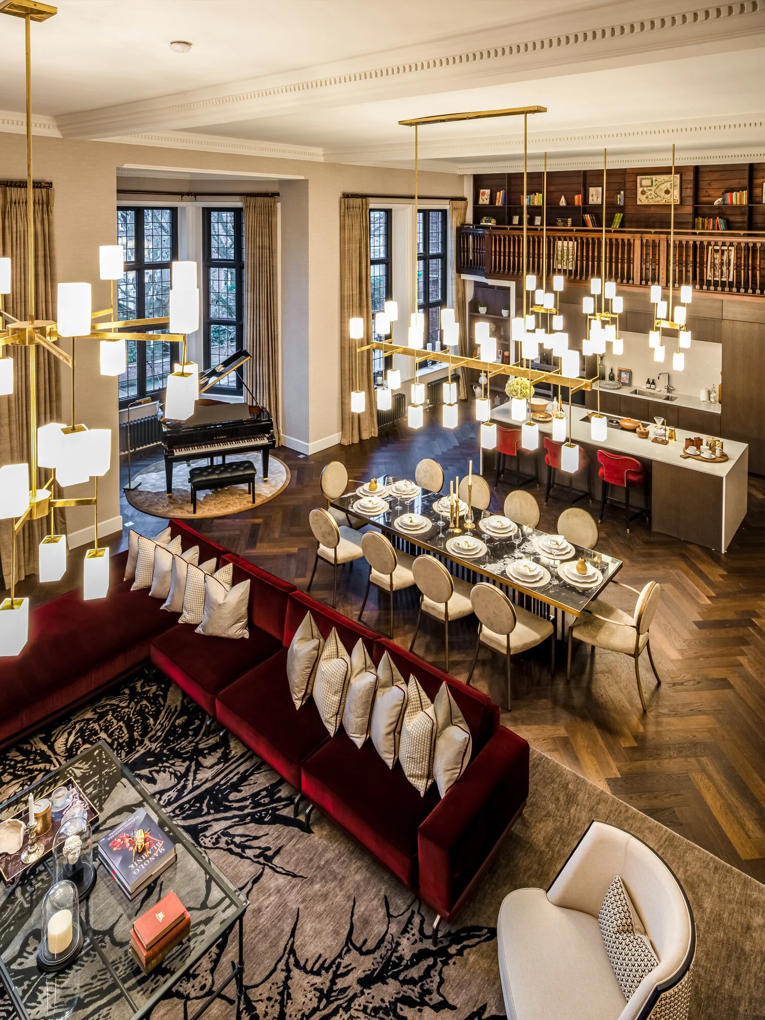 The impressive reception room is split into a spacious kitchen, a dining area ideal for entertaining, and a living space nestled away from the bustle of the kitchen. A secret reading room – formerly a passageway to the college’s dining hall – offers a peaceful private retreat, dressed with an immersive ‘secret garden’ concept. The Skeel Library master suite is all grand proportions and beautiful finishes. A sumptuous sleeping area is separated from space designed for relaxing by a feature wall that allows daylight from the bay window to pour in. Then there are three additional bedrooms, one inspired by the beloved children’s novel ‘The Wind in the Willows’ – and a self-contained guest suite with its own terrace and a bedroom dressed in sultry green and navy fabrics.